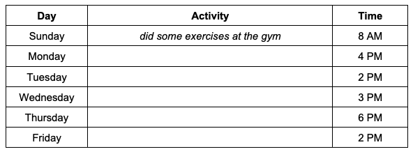 I was pretty busy last week. On Sunday, I was at the gym doing some exercises. I went to the dentist on Monday at four. Then, on Tuesday afternoon, I was training at the soccer field with my friends. On Wednesday, at 3 in the afternoon, I was at the cinema with Nick. Thursday evening was the best. I was at McDonalds. it was my birthday. On Friday afternoon, I was training at the soccer field again.