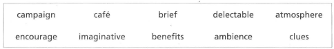 List your product's (4) ____ and include them in the slogan to (5) ____ consumers to try it out. Examples of benefits for a cafe might include provides delightful (6) ____, great (7) ____, and delectable menu.