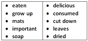 Coconut trees are typical of tropical areas. They can (1) ____ to 30 m in height and 45 cm in diameter. Coconut trees have rings, where former leaves were. When the white inner meat of coconut is (2) ____, it produces copra. Copra generates oil that people use to make (3) ____ and candles. Coconut meat is (4) ____ in tropical countries. It can be consumed raw or processed beforehand. People consider the palm cabbage, its terminal bud, to be very (5) ____. It is so delicious that sometimes coconut trees are (6) ____ for it. The young stem has a centre that can be (7) ____ and it also produces juice. People in tropical countries like to drink the juice which is called sap. It can be (8) ____ directly or fermented for a few hours. People also make roof out of dried coconut (9) ____. They plait them to create baskets and (10) ____. The fibre of coconut's husk is used to make rope.