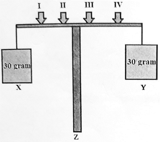 Jika beban Y diganti menjadi 20 gram, maka agar tuas tetap seimbang tiang Z harus digesar ke titik ....