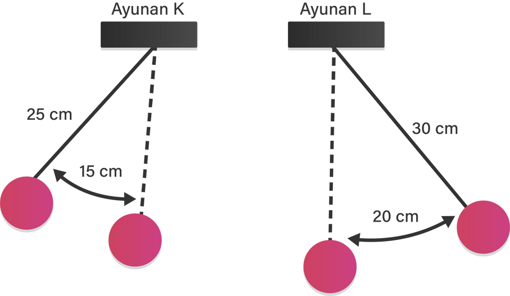 Jika beban ayunan L = 2 kali dari K, maka periode (T) dan frekuensi (f) yang benar, dari ayunan K dan L adalah ...