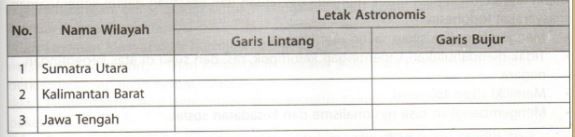 Carilah lima provinsi di Indonesia dengan menggunakan atlas. Setelah itu, tuliskan letak astronomisnya pada tabel seperti berikut!