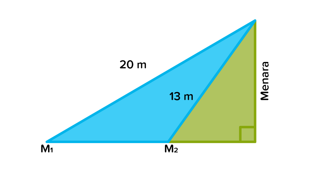Habel mengamati dua mobil dari puncak menara yang jarak masing-masingnya ke Habel seperti tampak pada gambar berikut. Jika tinggi menara adalah , maka jarak kedua mobil adalah ...