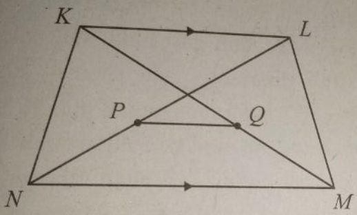 Diketahui KL = 10 cm dan MN = 14 cm. P dan Q berturut-turut adalah titik tengah LN dan KM. Tentutkan panjang PQ.