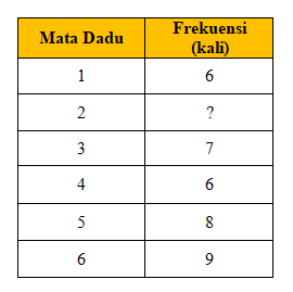 Berikut ini tabel yang menyatakan hasil percobaan penggelindingan sebuah dadu. Jika percobaan tersebut dilakukan sebanyak 40 kali, maka banyak peluang empirik kemunculan mata dadu "2" adalah ...