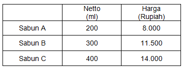 Suatu ketika Fandi berbelanja sabun mandi ke suatu minimarket. Ketika masuk di minimarket, fandi melihat ada tiga jenis kemasan sabun mandi untuk merek yang akan dia beli. Ringkasan kemasan dan harga masing-masing sabun mandi tersebut disajikan sebagai berikut.