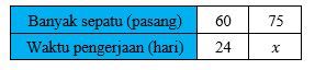 Tabel di atas menunjukan waktu yang dibutuhkan oleh seorang perajin untuk membuat sepatu. Berapa hari yang diperlukan untuk membuat pasang sepatu?